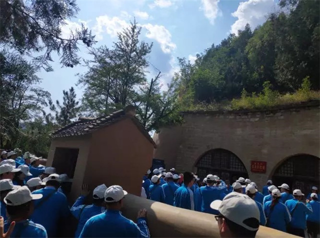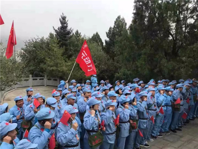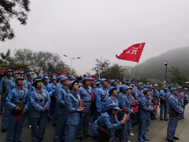 魏巍宝塔山,滚滚延河水,一支“红军”大部队挥舞着国旗,振奋昂扬的踏步走向宝塔山之巅,在宝塔下听着党的辉煌事迹,共同缅怀革命先烈,发扬延安精神。